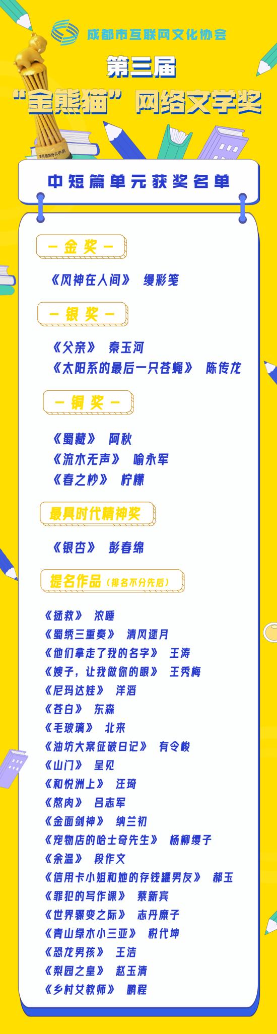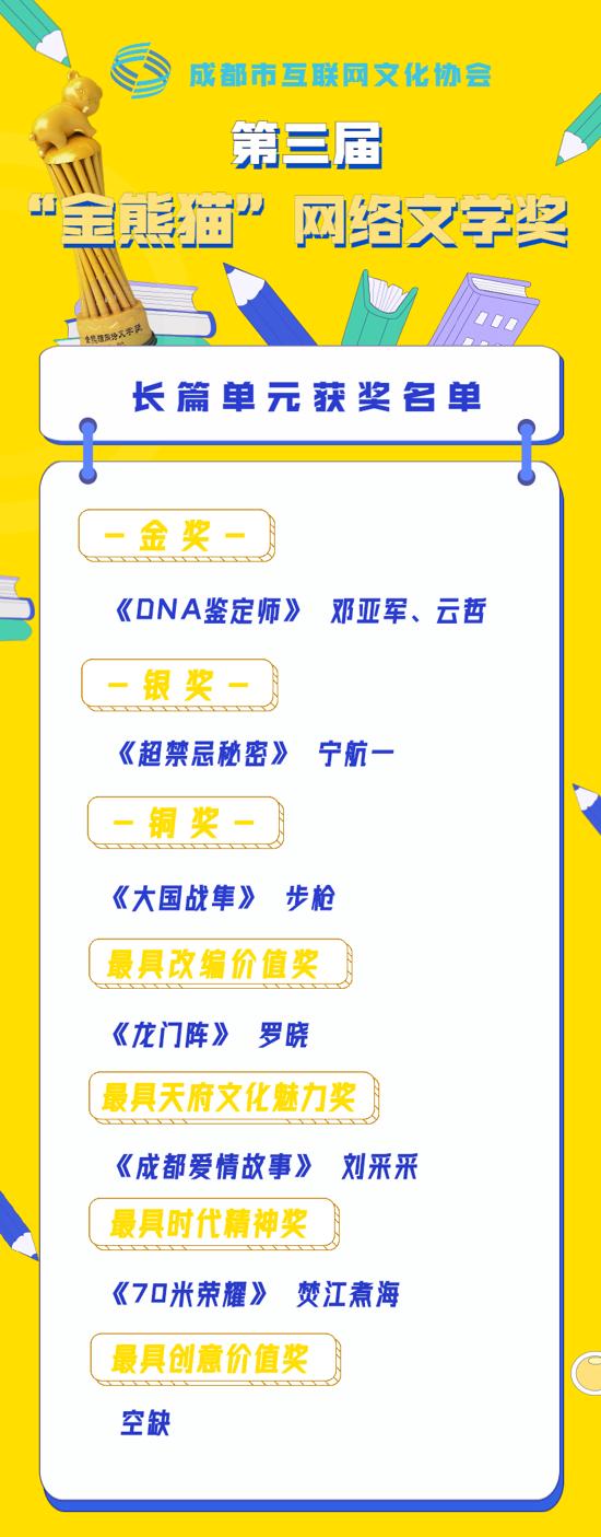 日前,由四川省互联网信息办公室、成都市互联网信息办公室指导,成都市互联网文化协会主办的第三届“金熊猫”网络文学奖,经过初评、复评、终评三轮评定。6部长篇获奖作品,7部中短篇获奖作品已产生。